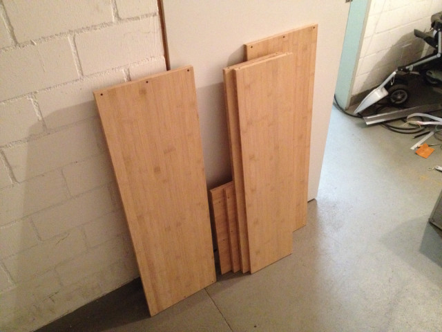 Aktuell bastele ich an einem neuen TV-Regal. Ich habe den Entwurf komplett selber gezeichnet und ich möchte das Regal aus Bambusholz bauen. Dazu habe ich im Bauhaus günstiges Holz gefunden. Die können das dort auch schon zuschneiden, das kann man selber nicht so gut. Dann will ich das alles schön verleimen.