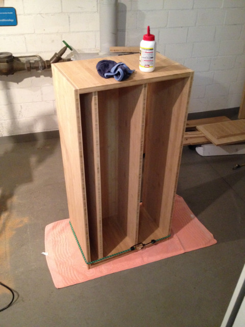 Aktuell bastele ich an einem neuen TV-Regal. Ich habe den Entwurf komplett selber gezeichnet und ich möchte das Regal aus Bambusholz bauen. Dazu habe ich im Bauhaus günstiges Holz gefunden. Die können das dort auch schon zuschneiden, das kann man selber nicht so gut. Dann will ich das alles schön verleimen.